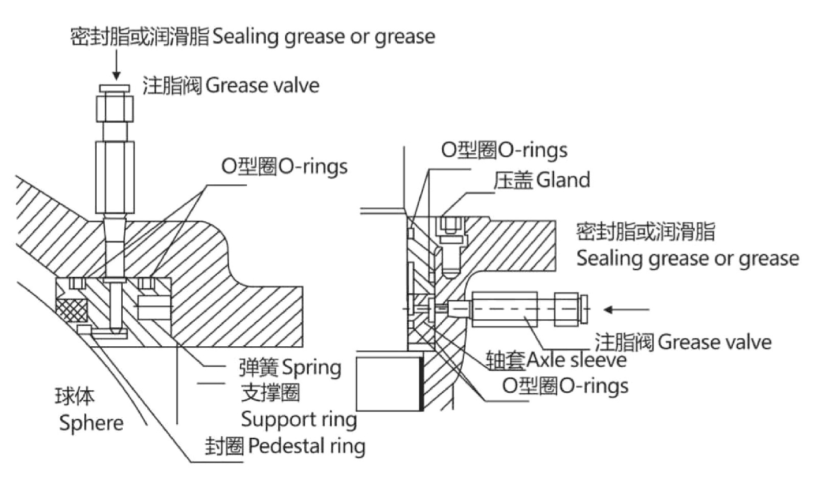 阀座及阀杆密封件出现损伤而引起泄漏时,可通过注脂阀注入密封脂,起到暂时密封作用。