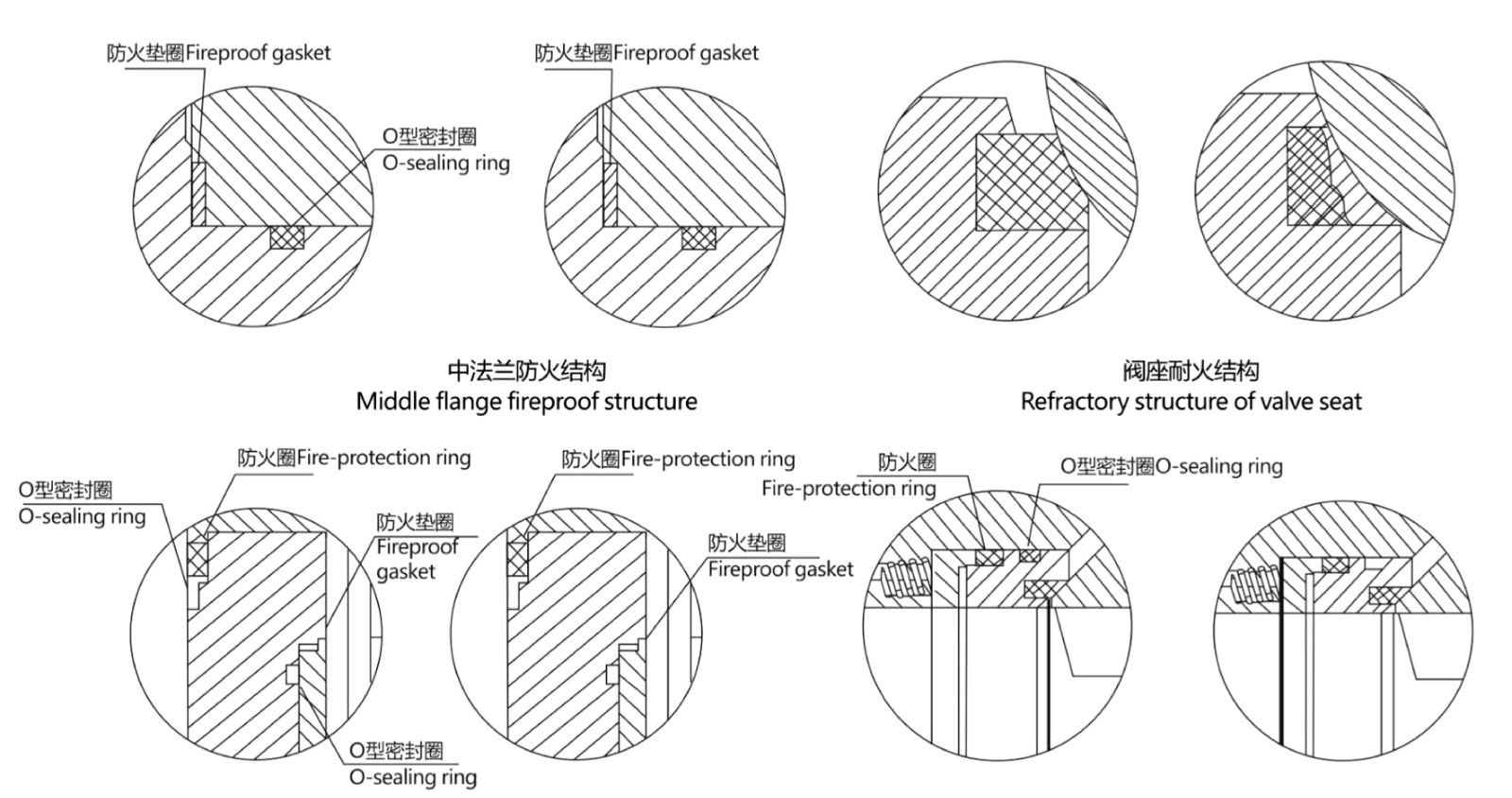 在意外发生火灾或异常升温使非金属阀座软化烧损时,特殊设计的阀座支撑金属密封面在弹簧载荷的作用下,与球体形成金属与金属接触,能够起到瞬时密封作用。