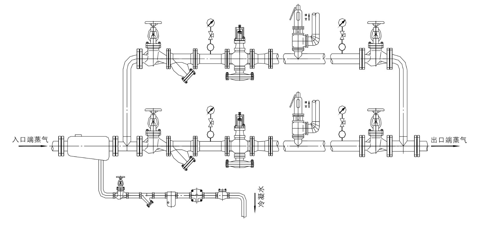减压站中的减压阀应根据管道上,下游压力和蒸汽流量选择口径大小.一般减压阀最少比上游管道小一个口径.其它管道件如汽水分离 器,过滤器,截止阀等应与管道同口径.如有需要,减压站可安装旁通阀以备紧急情况使用,旁路阀应安装在减压阀上方与减压阀同口径