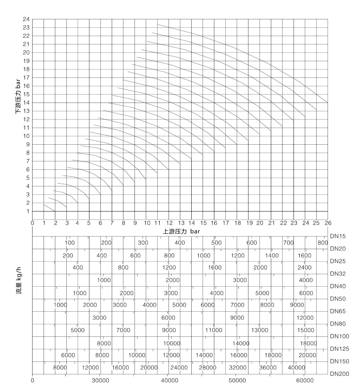 例:蒸汽流量为600kg/h,压力从6bar减至4bar。在表中找到上游压力为6bar的曲线和下游压力为4bar的交点,从该点垂直身下,找到所有系列口径的容量。在该列中DN32的阀是能满足要求的最小口径阀。