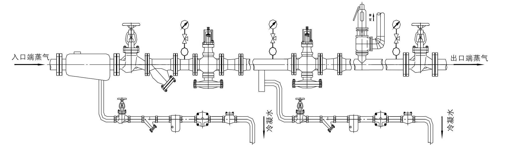 减压站中的减压阀应根据管道上,下游压力和蒸汽流量选择口径大小.一般减压阀最少比上游管道小一个口径.其它管道件如汽水分离 器,过滤器,截止阀等应与管道同口径.如有需要,减压站可安装旁通阀以备紧急情况使用,旁路阀应安装在减压阀上方与减压阀同口径