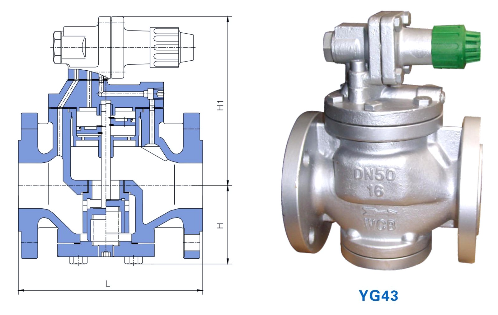 YG43导阀型活塞式减压阀为铸钢材质阀体。由主阀和导阀两部分组成。通过调节调节弹 簧压力设定出口压力,利用膜片传感出口压力变化,通过导阀启闭驱动活塞调节主阀节流部位过 流面积的大小,实现减压稳压功能。