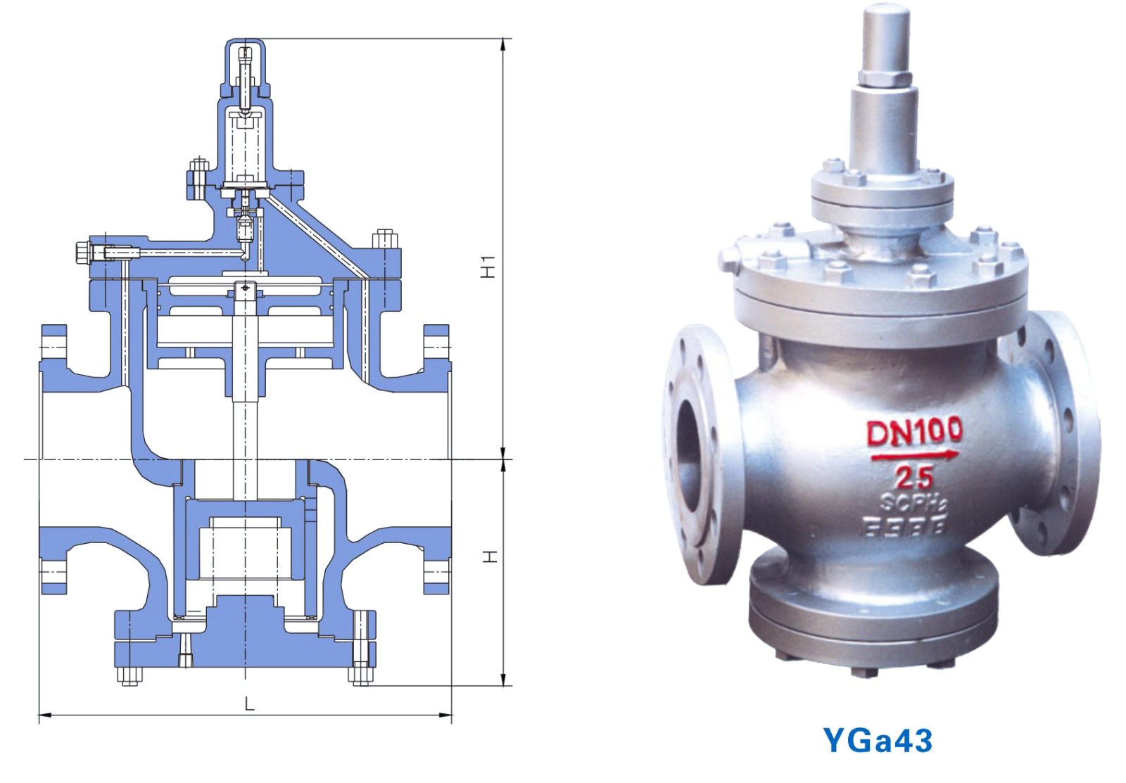 YGa43 导阀型活塞式减压阀为铸钢材质阀体。由主阀和导阀两部分组成。本产品在普通减 压阀基础上作了很大改进,加大了活塞面积,改变了节流结构。改变了密封形式,加大了过流面积 等等,从而在提高灵敏度,流量,寿命等方面大大改善了性能。