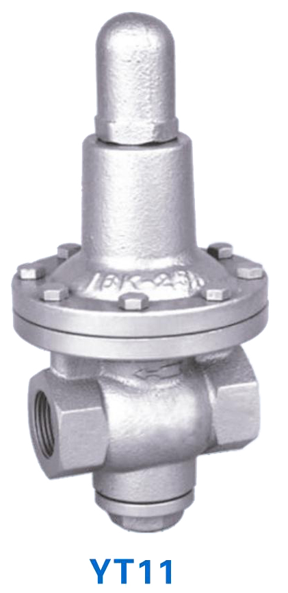 YT11型减压阀是参考国外同类产品研制开发的,属于直接作用弹簧薄膜式减压阀,其突出特点是加大了膜片工作面积,因此,和同类减压阀相比,膜片对下游压力变化的传感特别明显,下游压力的微小变化(例如0.01 Mpa)都将引起膜片和阀芯明显的调节动作,从而大大提高了稳定功能。